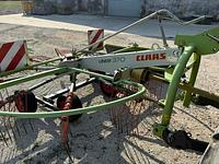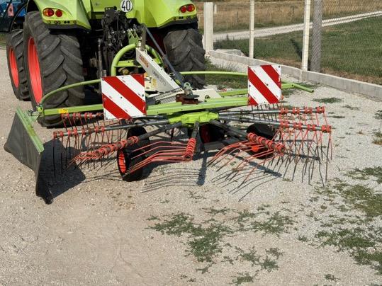 Rastrillo hilerador Claas Liner 370, año 2012, con un ancho de trabajo de 3,70 metros y equipado con eje tándem. Este modelo presenta un cabezal giratorio y se encuentra en muy buen estado.